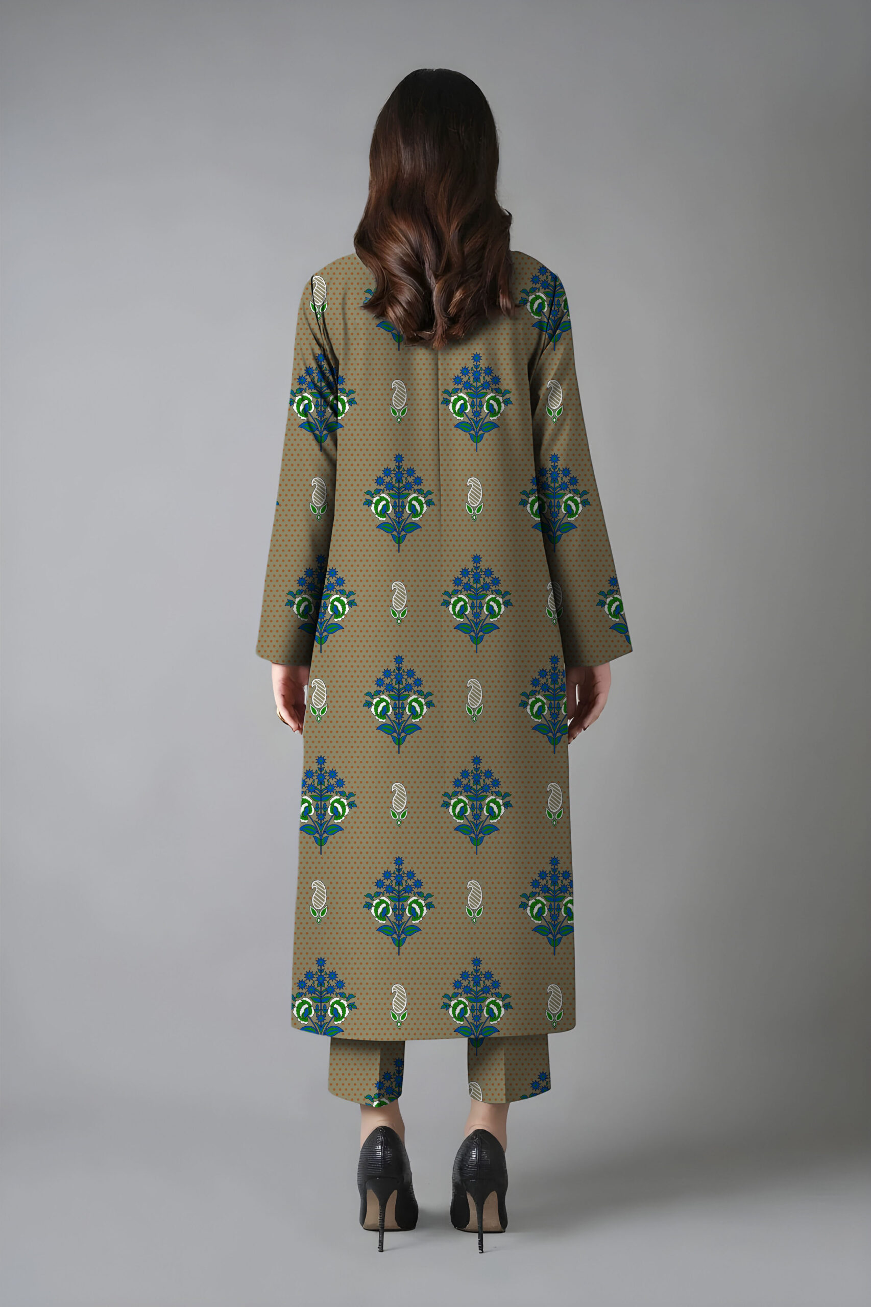 This outfit combines the warmth of linen with the lightweight flow of chiffon, offering a balanced look perfect for seasonal wear.