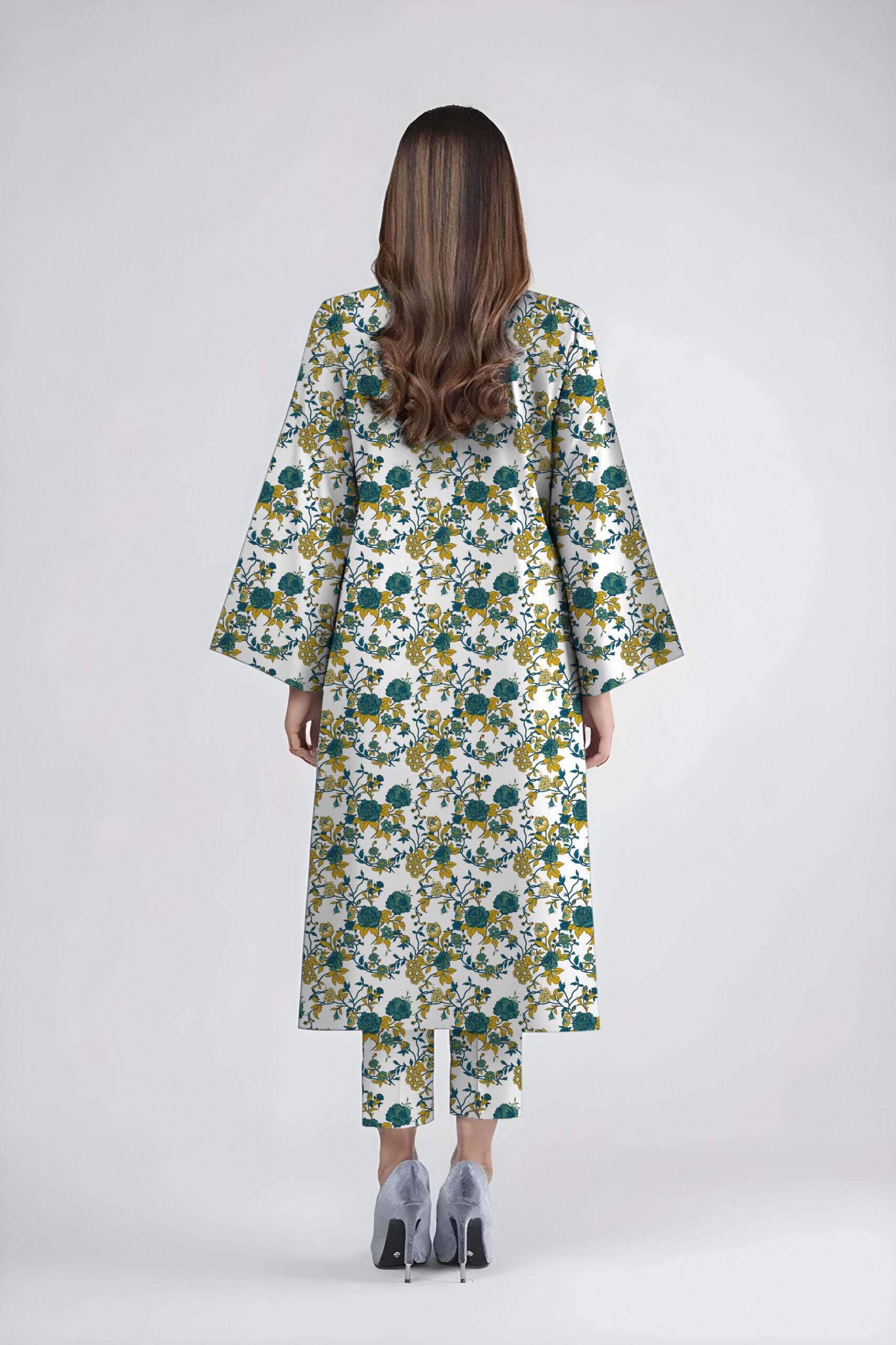 This outfit combines the warmth of linen with the lightweight flow of chiffon, offering a balanced look perfect for seasonal wear.